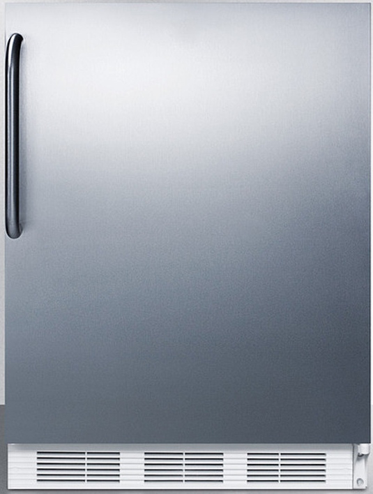 Sized with a 24” footprint, the CT661WCSSADA refrigerator-freezer offers a generous 5.1 cu.ft. storage capacity, larger than many units in this size class. The 32” height and front-breathing design makes it ideal for installation under lower counters complying with ADA guidelines for height restriction. The fully finished cabinet also enables freestanding use. This unit comes with a fully wrapped stainless steel door and cabinet. A curved towel bar handle in brushed stainless steel completes the professional look.