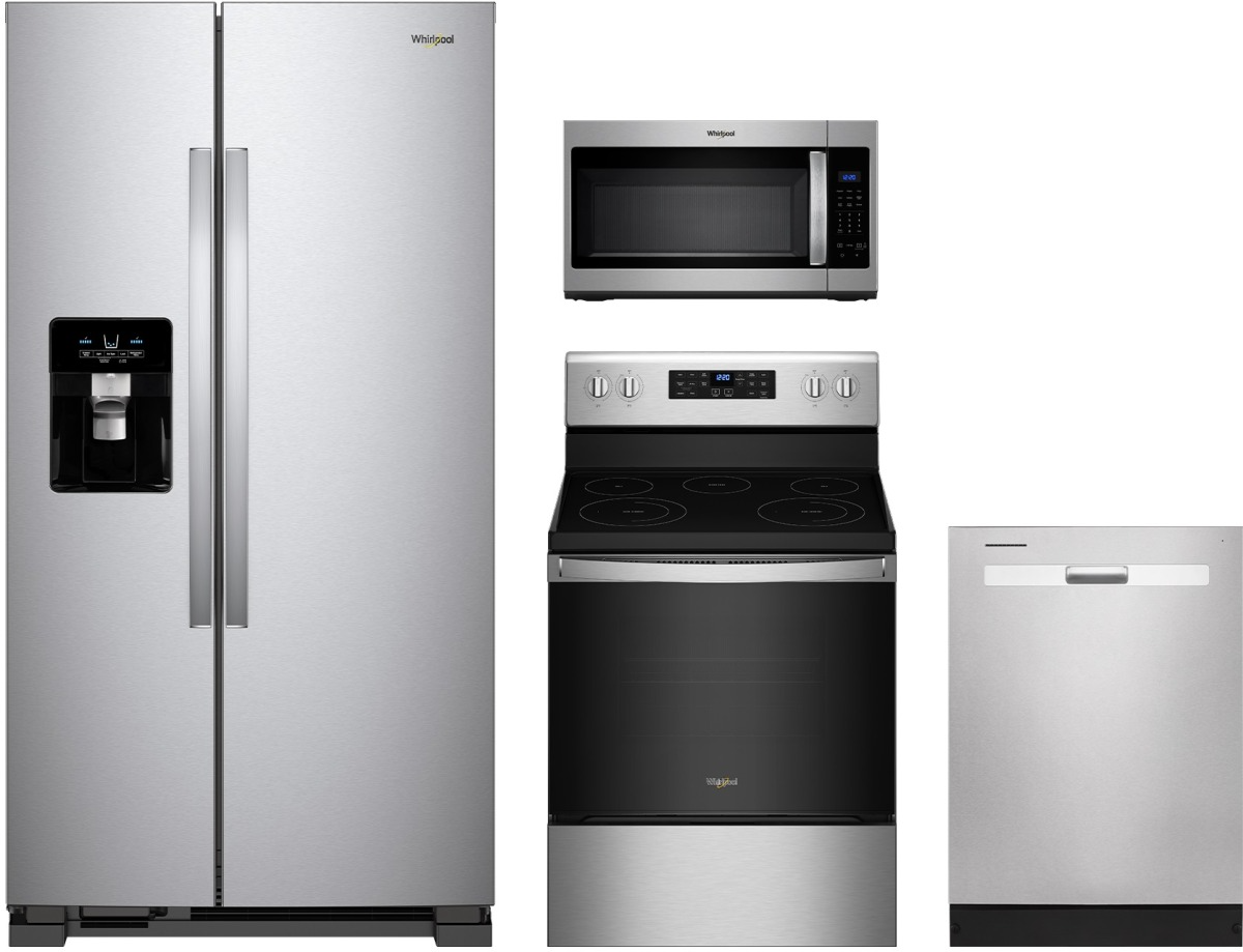 Whirlpool® 4 Piece Stainless Steel Kitchen Package with side-by-side refrigerator, freestanding electric range, built in dishwasher and over the range microwave.Read More