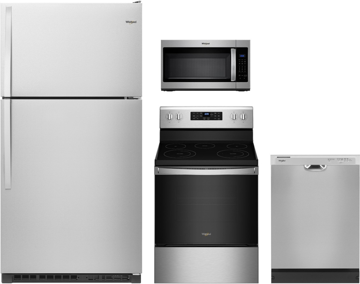 Whirlpool® 4 Piece Stainless Steel Kitchen Package with top freezer refrigerator, freestanding electric range, built in dishwasher and over the range microwave.Read More